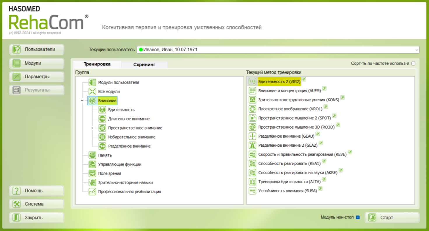 RehaCom - это комплексная и сложная система программного обеспечения для компьютерной когнитивной реабилитации. Этот практический инструмент помогает терапевту в реабилитации когнитивных расстройств, которые влияют на определенные аспекты внимания, концентрации, памяти, восприятия, повседневную деятельность и многое другое.
